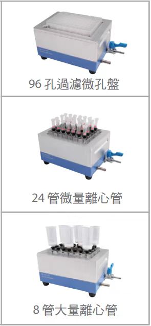 獨(dú)特設(shè)計(jì)的離心管轉(zhuǎn)置板以及魯爾(Luer)接頭,讓W(xué)elVac真空純化裝置成為一個(gè)高兼容的平臺(tái),適用各種樣式的離心管及96孔過(guò)濾微孔盤(pán)。