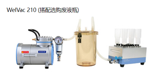WelVac 210 結(jié)合真空源成為一套完整的真空純化系統(tǒng),全套包含Rocker 300 無(wú)油式真空泵、連接硅膠管、廢液收集盒,若使用大容量離心管時(shí)亦可選購(gòu)廢液瓶以收集大量廢液。